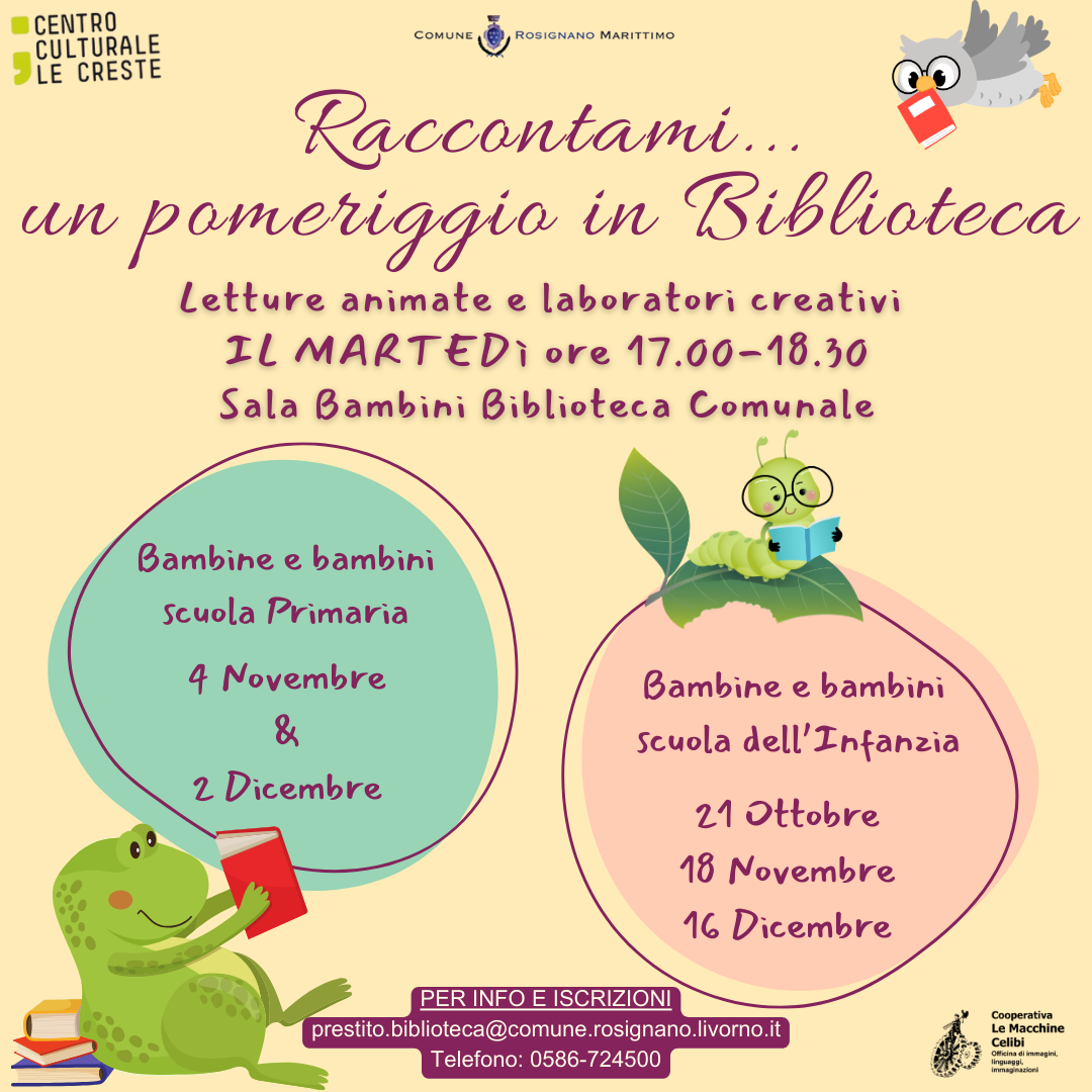 Gli appuntamenti sono specifici per per fascia di età. Per i bambini e le bambine da 3 a 5 anni gli appuntamenti sono il martedì pomeriggio del 21 ottobre, 18 novembre e 16 dicembre; per la fascia di età dai 6 agli 11 anni, il martedì pomeriggio del 4 novembre e 2 dicembre.