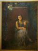 Dipinto a olio su tela raffigurante una giovane donna su una sedia e vista di fronte. la donna tiene le gambe accavallate e posa il braccio destro sullo schienale della sedia.