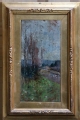 Nella tavola di formato verticale, perimetrata da cornice modanata in legno dorato, lavorata a intaglio, è raffigurato uno scorcio di paesaggio. In primo piano a sinistra risaltano sul verde smeraldo del prato i ciuffi più scuri di una pianta bassa. Subito dietro gli alti fusti di quattro alberi spogli accentuano la verticalità del formato.