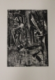 Litografia in bianco e nero raffigurante larghe pennellate, scritte e numeri.