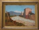 Il dipinto rappresenta un paesaggio. In primo piano vediamo una strada sterrata costeggiata sul lato destro da dei caseggiati, mentre sull'altro lato della strada si scorge un campo verde. Sullo sfondo vediamo i contorni di altre case e una montagna.