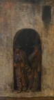 Dipinto a olio su tavola due figura maschili in piedi, inscritte all'interno di una porta con apertura ad arco. Entrambe le due figure, miseramente vestite, indossano un cappello e sono appoggiate ciascuna agli stipiti dell'apertura. Tra i due uomini sbuca, in basso, la testa di un bambino, che sembra affacciato a curiosare.