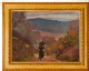 Dipinto a olio su tela raffigurante una contadina in piedi, che sorregge con entrambe le mani un fascio di legna poggiato sulla testa. La donna, vestita di nero, è vista di fronte, in mezzo ad una stradina sterrata fiancheggiata, a destra e a sinistra, da scrinali alberati. Sullo sfondo alte montagne azzurrate, contro un cielo, visibile nell'estrema parte superiore della composizione, solcato da cirri rosati.