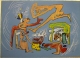 Litografia a colori su fondo azzurro raffigurante forme antropomorfe stilizzate di sapore incaico. Colori: giallo, verde, rosso, marrone.